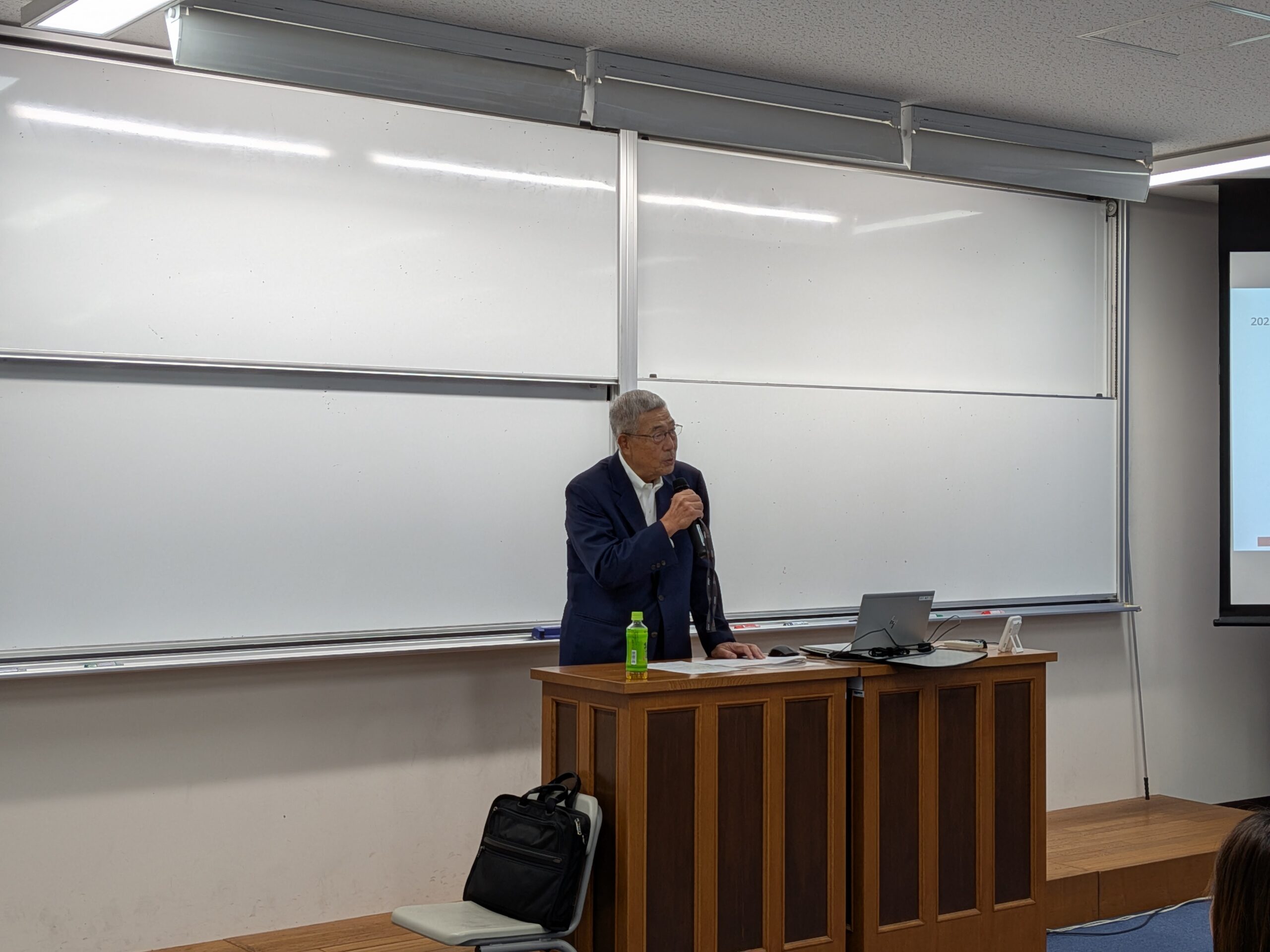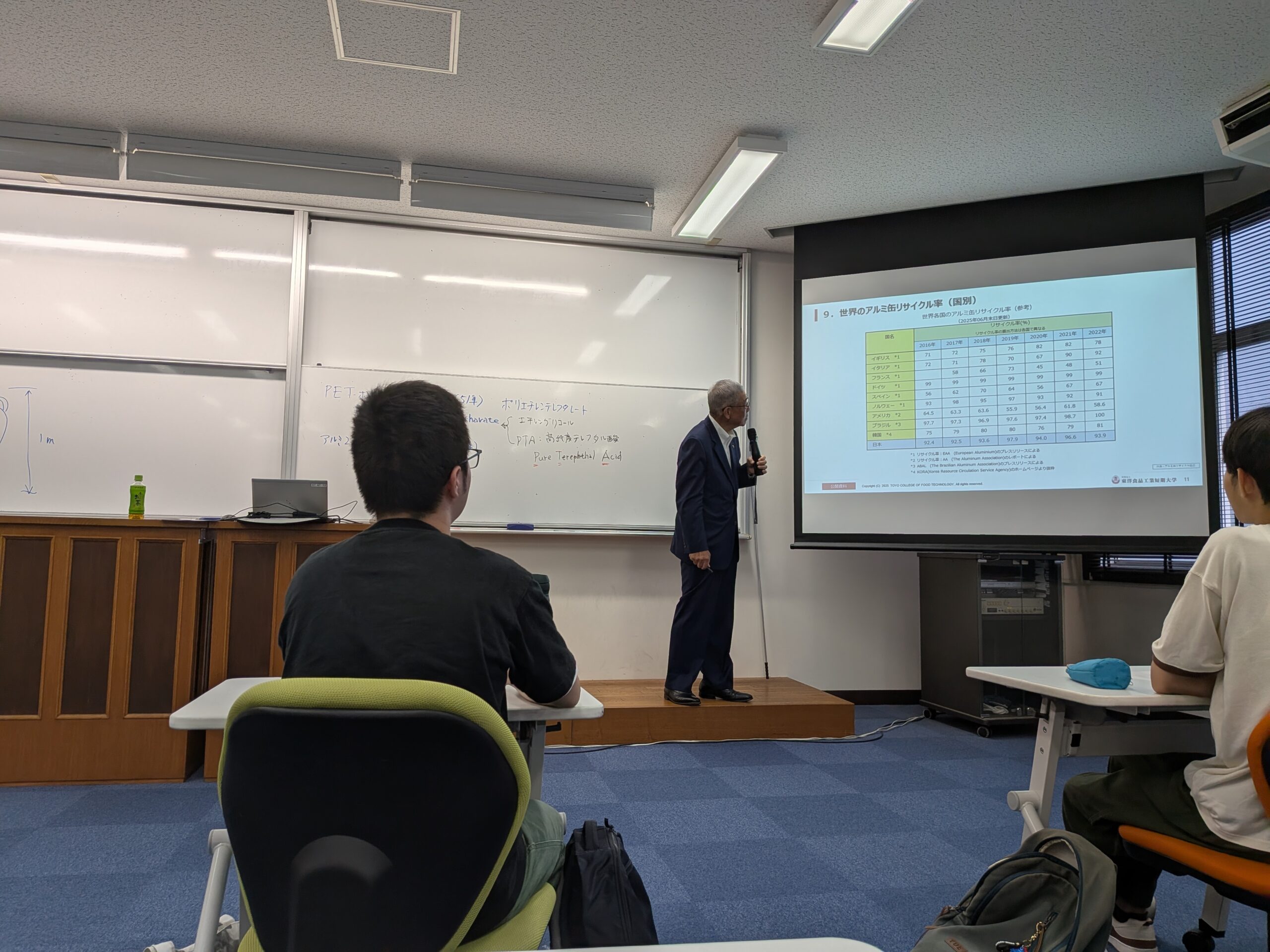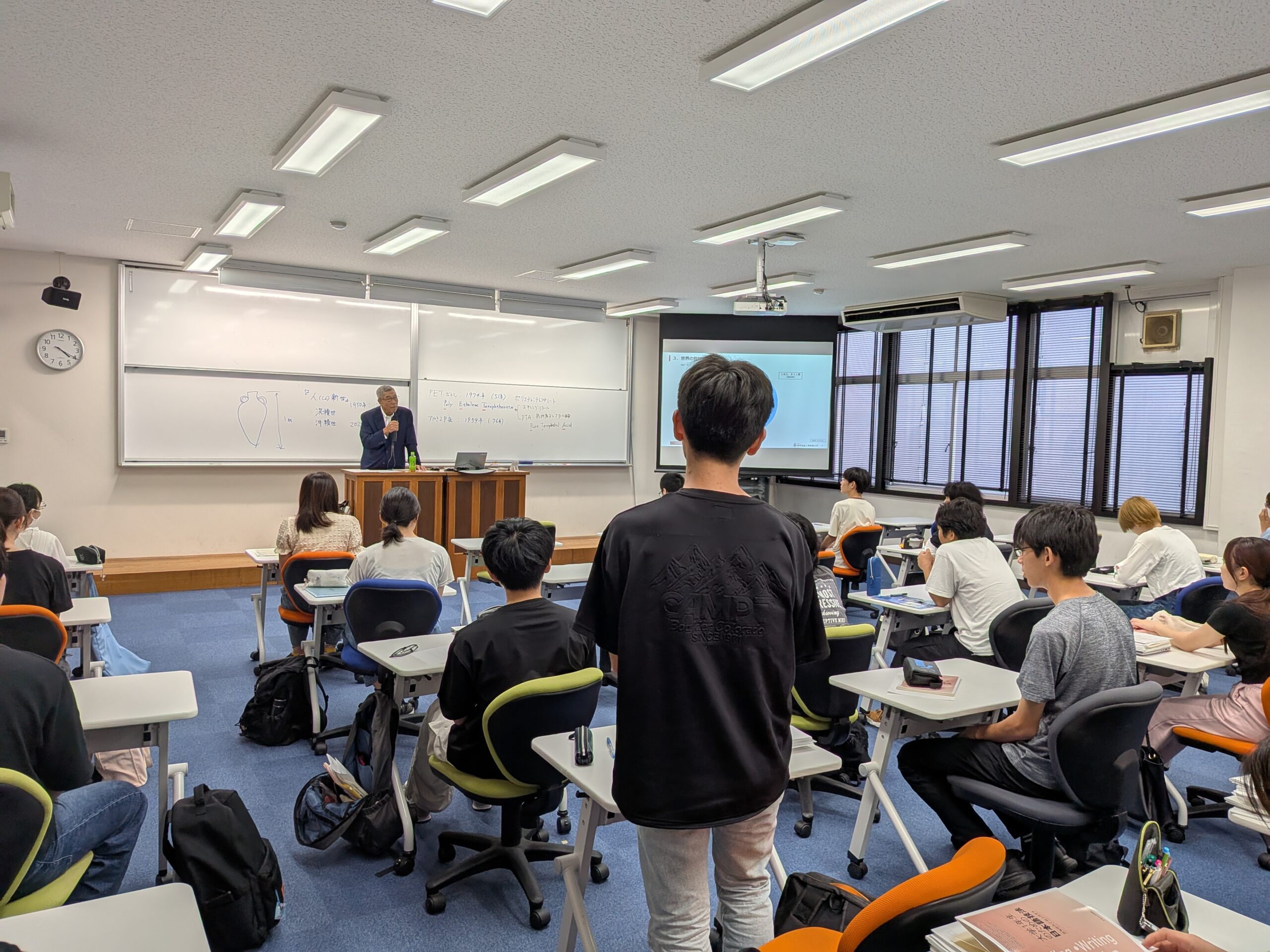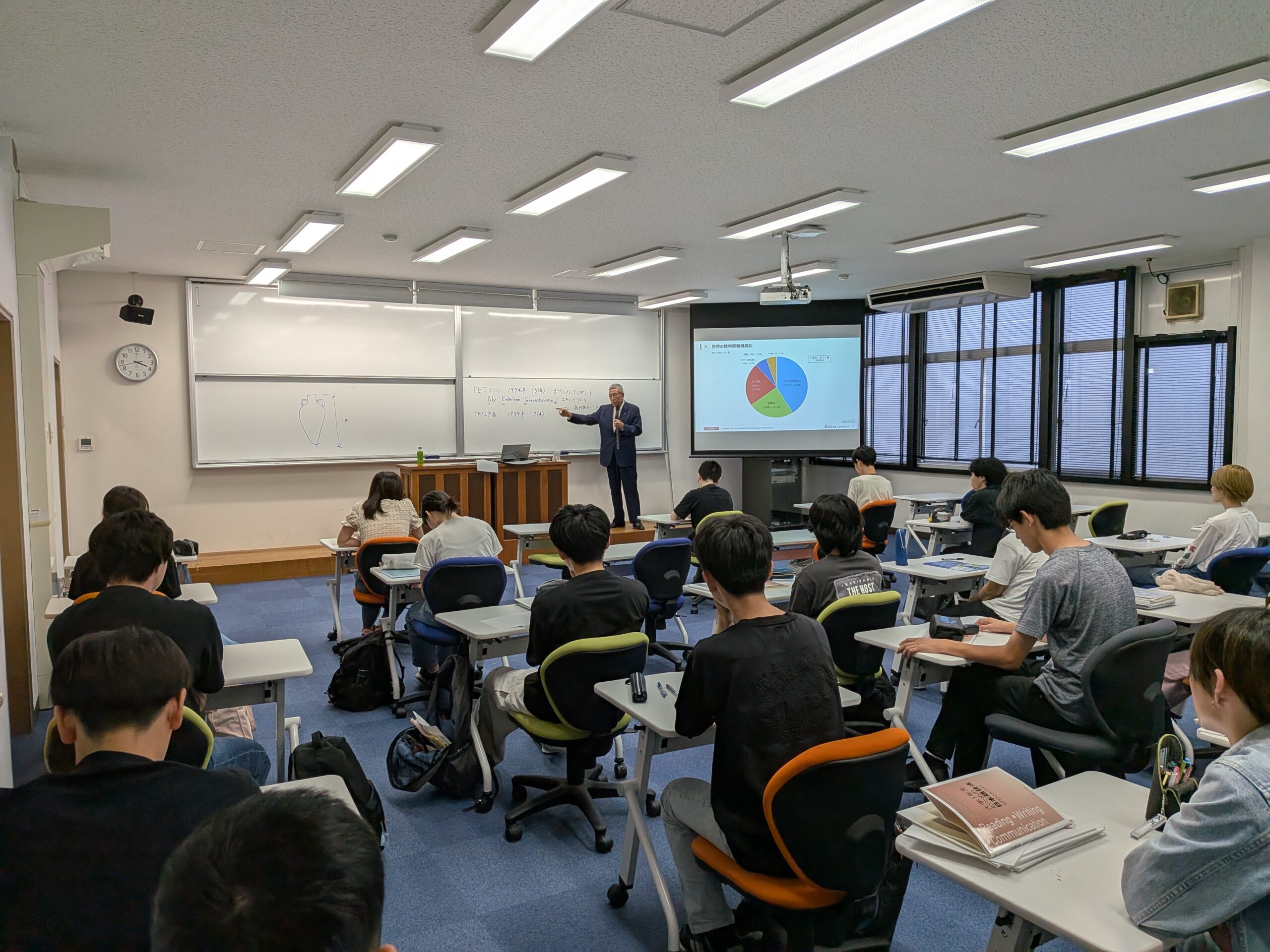 2025.10.01イベント 中井理事長が1年生に講話を行いました。 2025(令和7)年10月1日(水)午後3時30分から、中井隆夫理事長が1年生向けに講話を行いました。 人間の水分要求量や飲料容器の変遷に始まり、経済発展に伴う環境負荷等の社会課題に話題は発展しました。 理事長からは、近い将来食品・飲料企業で働くことになる皆さんが、社会が抱える課題にグローバルな視点で意識を向けていって欲しいとのお言葉がありました。 学生たちにとって今後の生活に大変有益な講話となったようです。