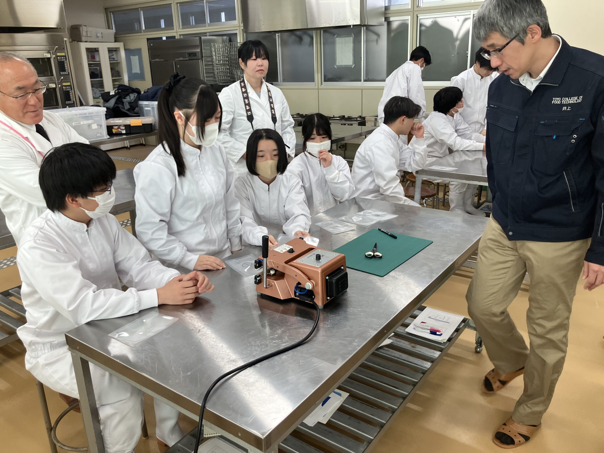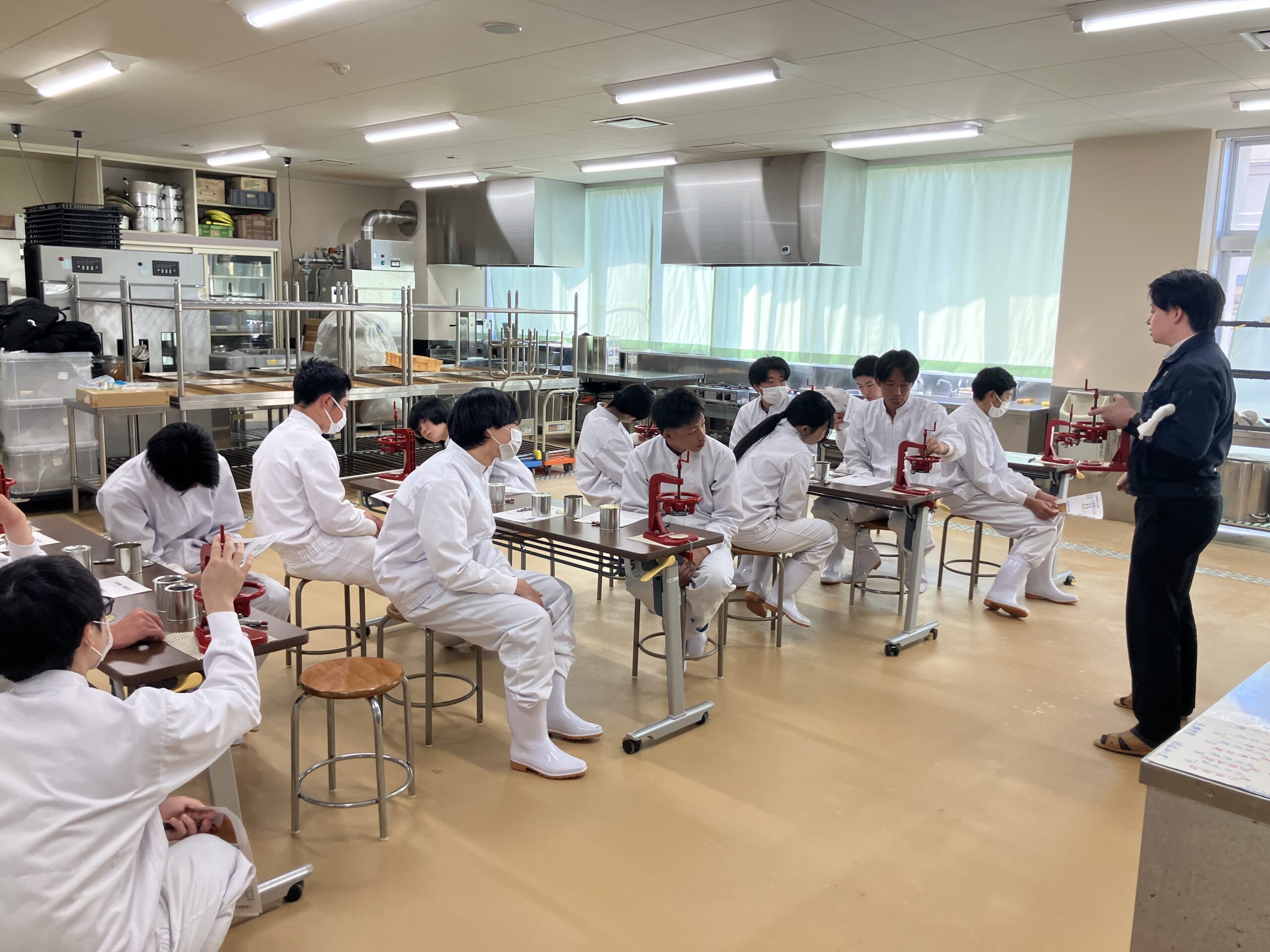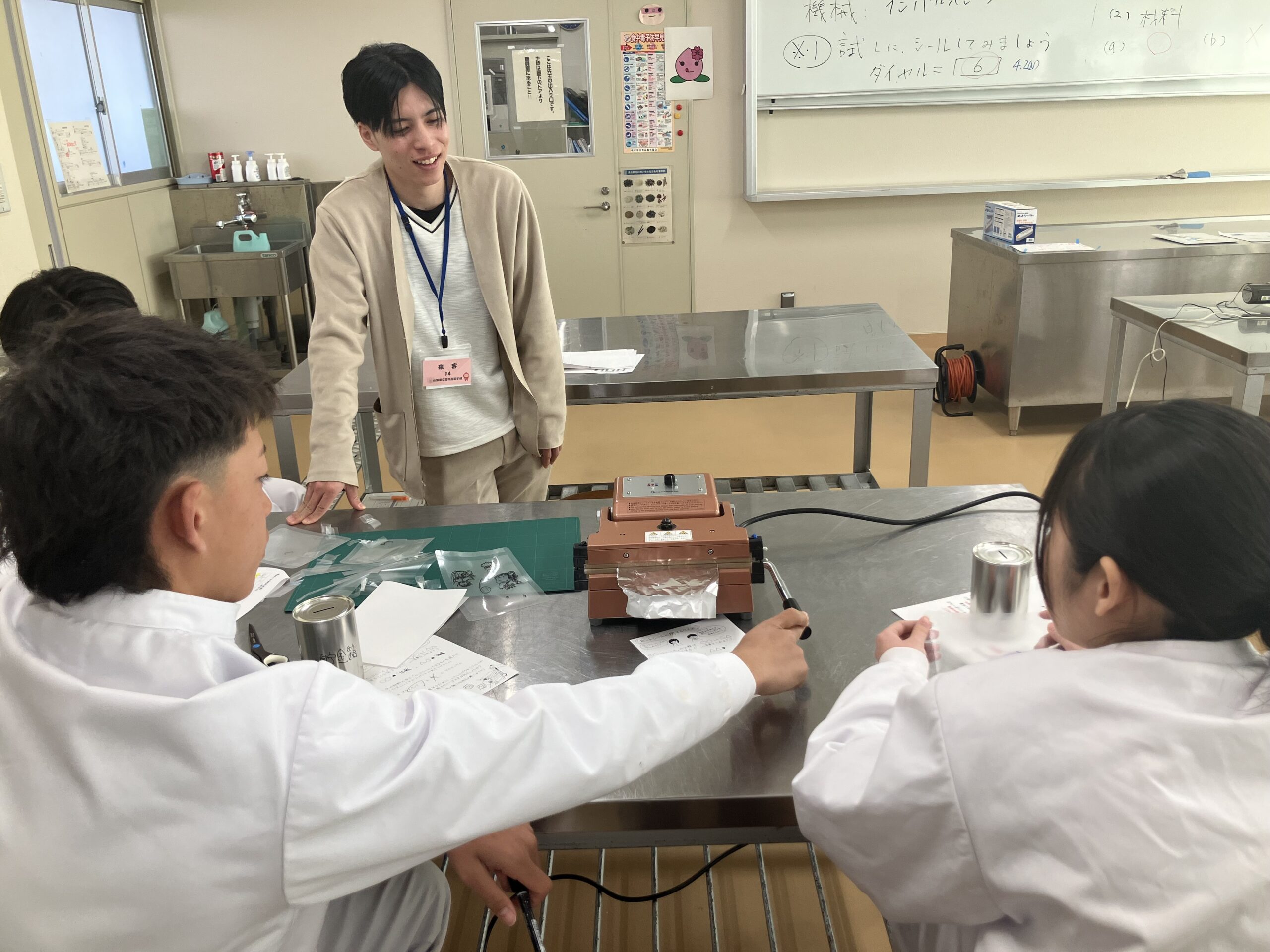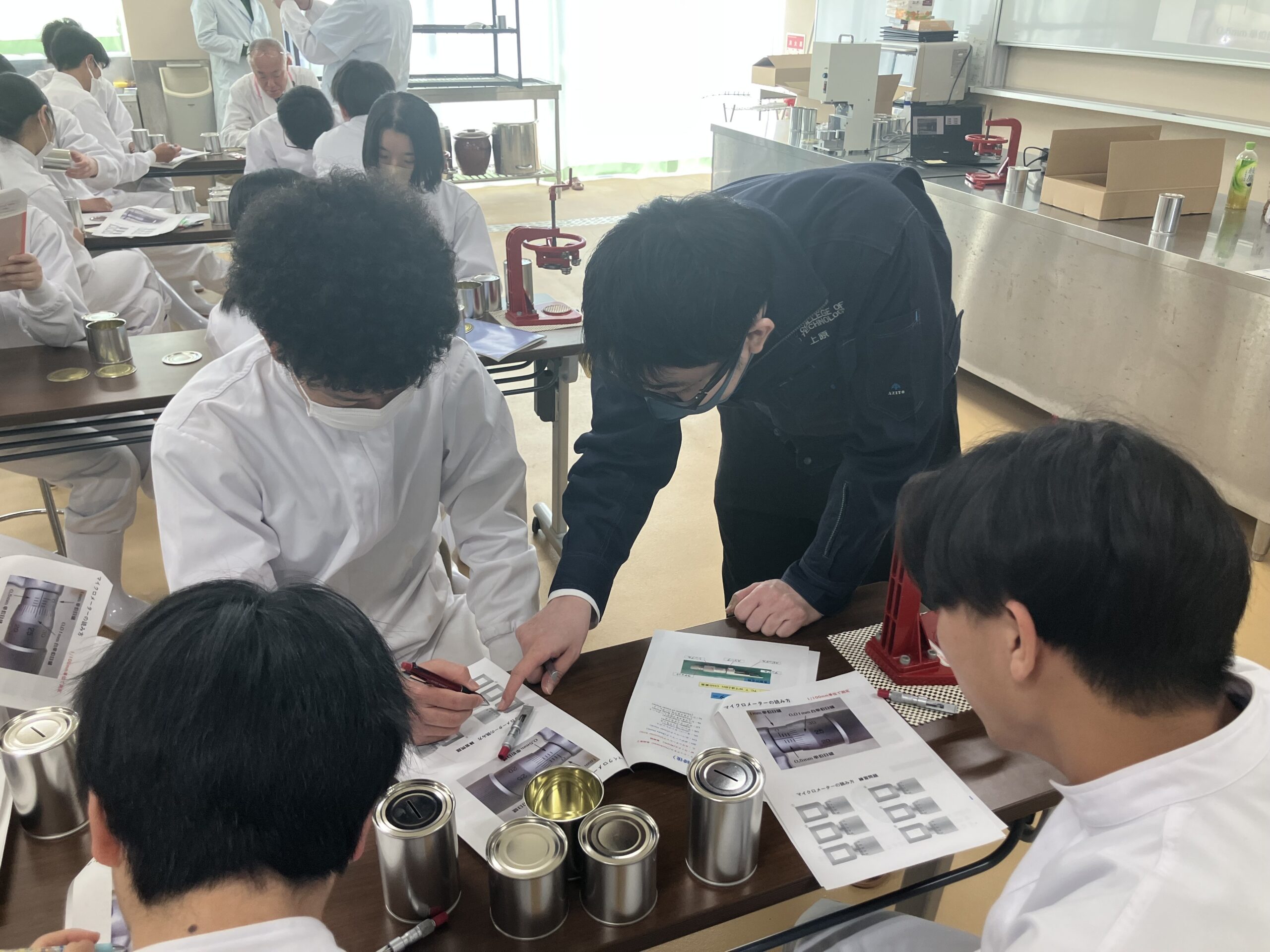 本学では、容器詰め食品の魅力を高校生の皆様に知っていただくことを目的に、出前授業を行っており、食品化学科2年生28名の皆さんに、二重巻締技術、ヒートシール技術