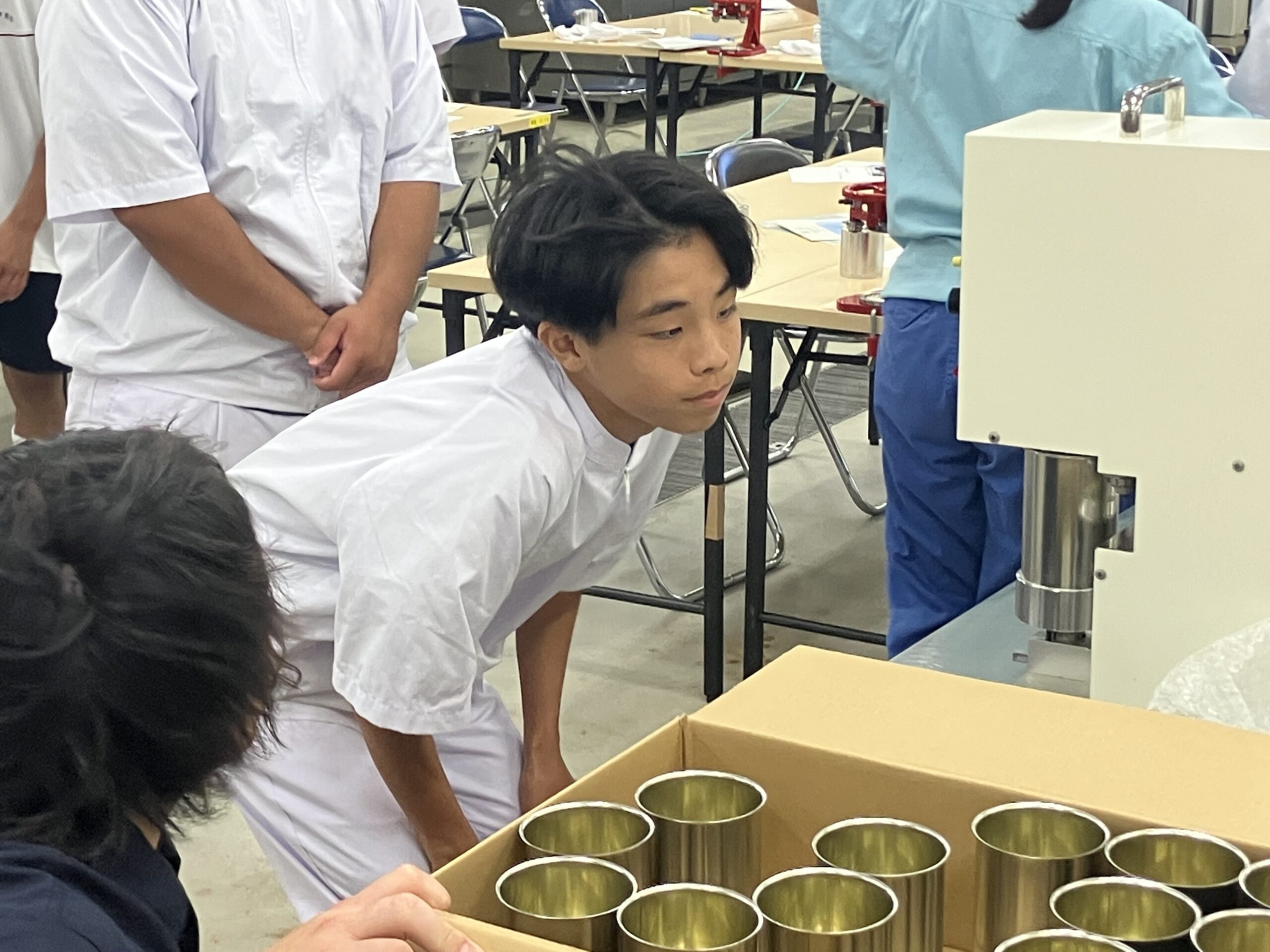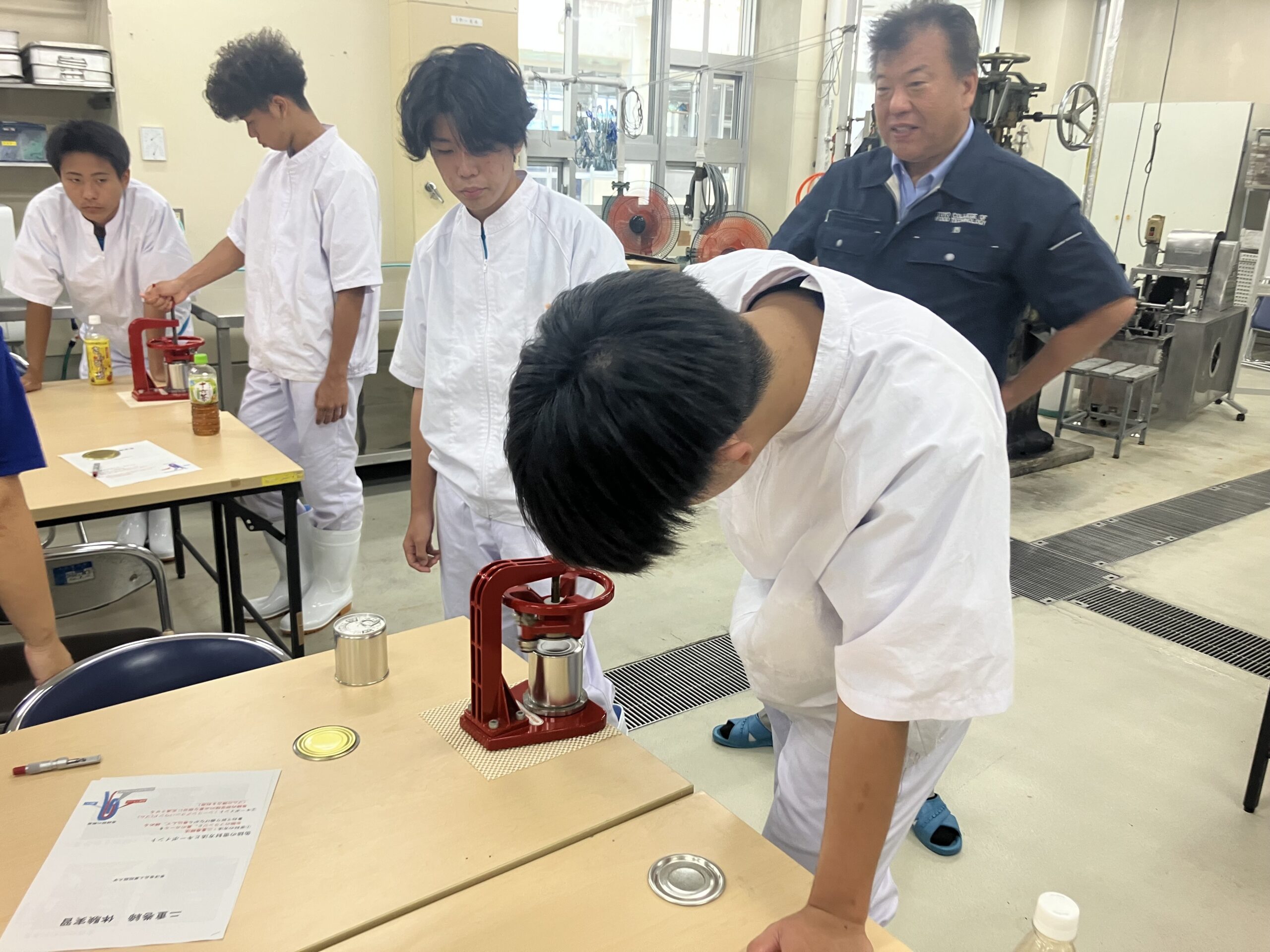 本学では、容器詰め食品の魅力を高校生の皆様に知っていただくことを目的に、出前授業を行っており、食品科学系列を選択されている2年生30名の皆さんに、二重巻締実習、ヒートシール実習を受講していただきました。