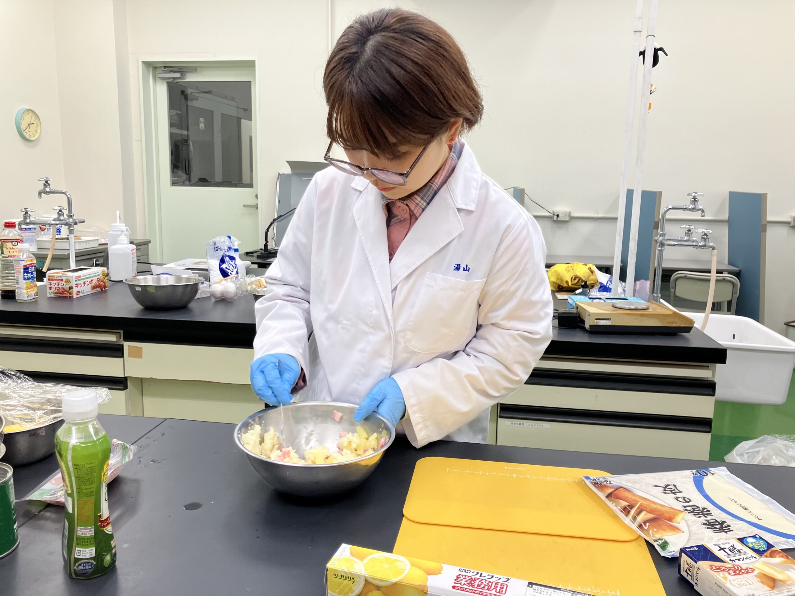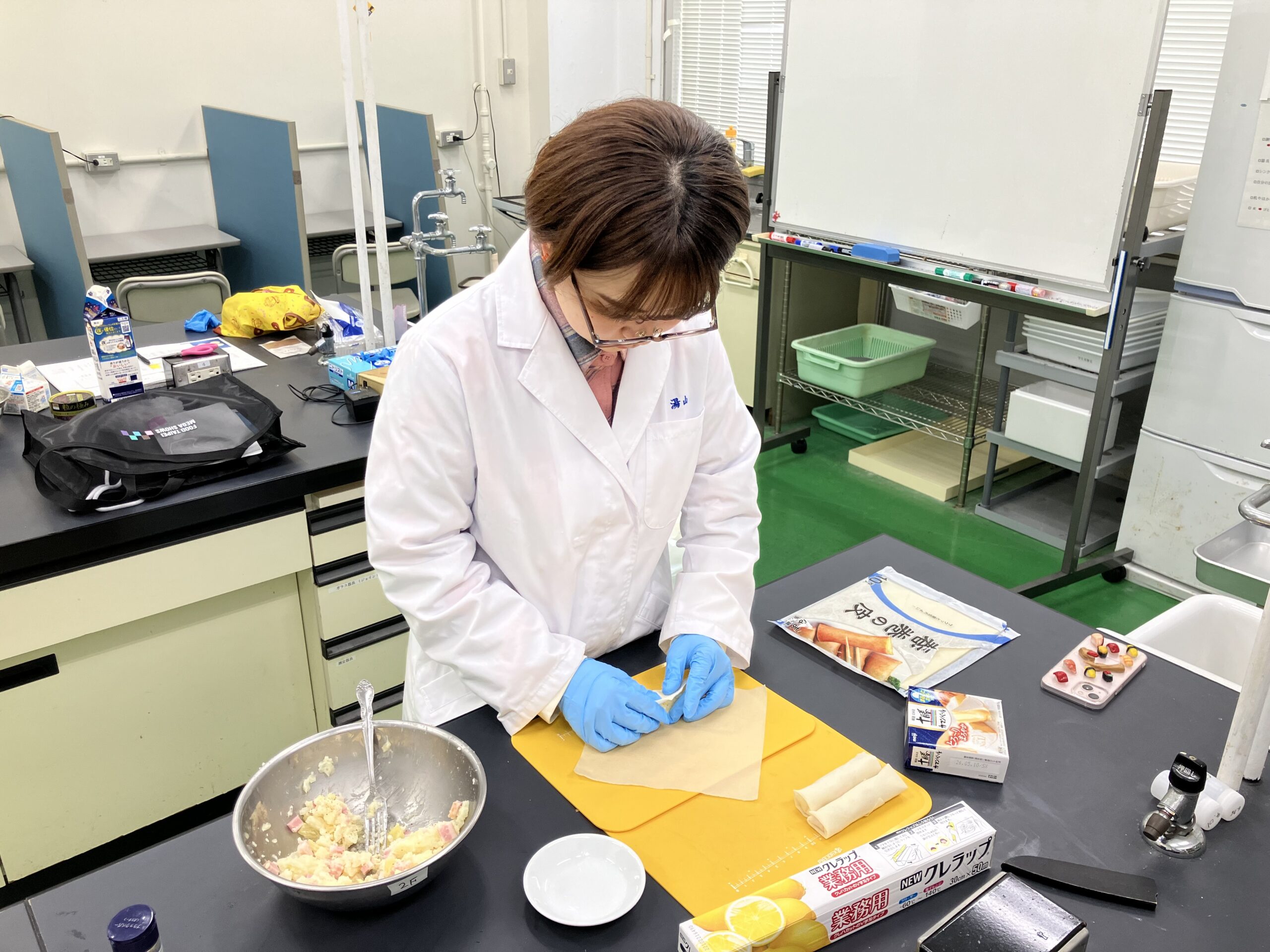 本学では、「製品開発プロセス研究」というテーマで卒業課題研究を実施しており、食品メーカーで30年あまりの開発経験を持つ実務家教員の指導のもと、各種消費者調査の実施、製品コンセプトの作成、製品試作などを行い、1年間で食品製品を一から作り上げる研究を行っています。料理コンテストへの応募は、この一環となります。