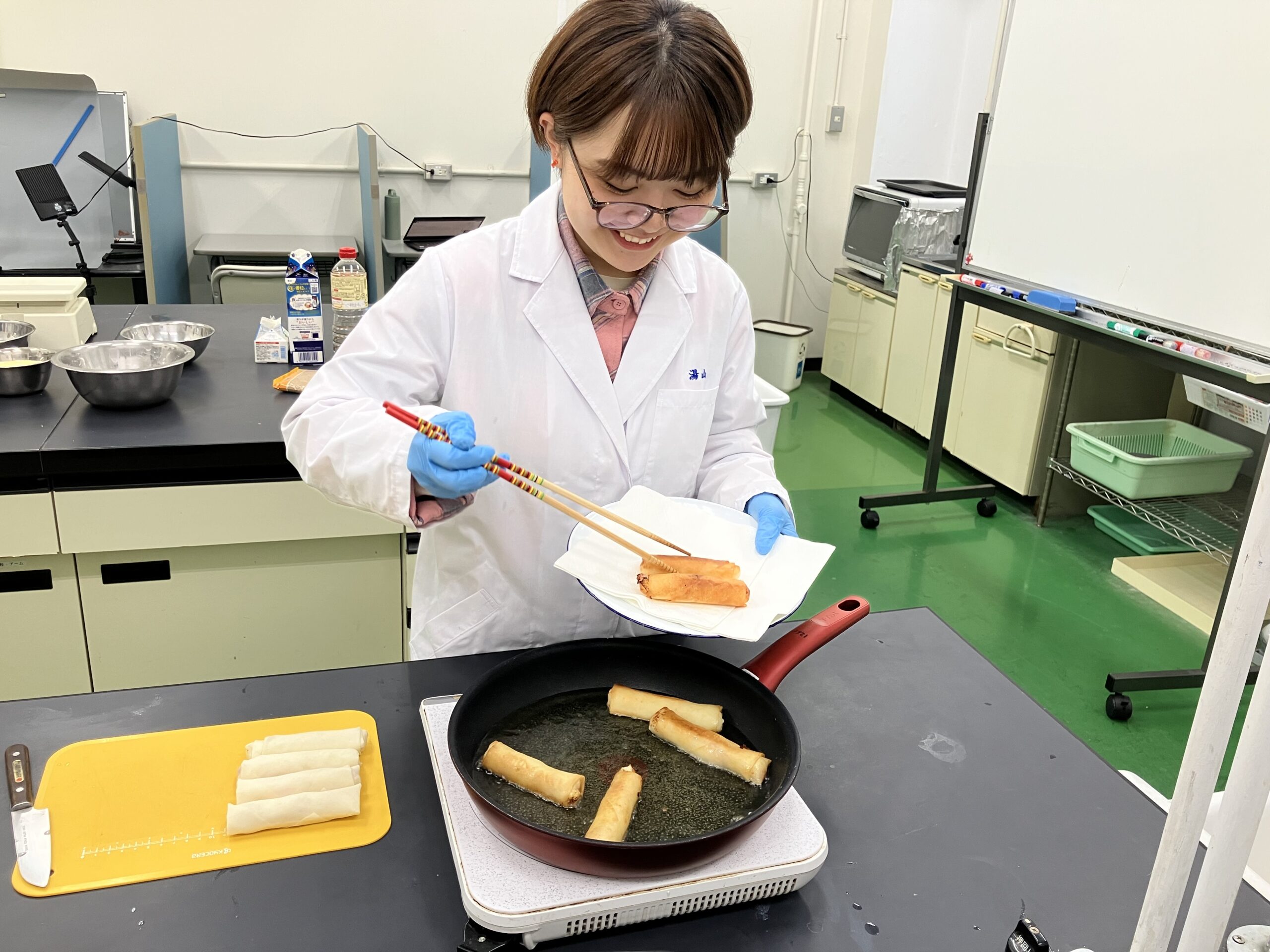ジャガイモ、ベーコン、カマンベールチーズの王道トリオにパインアップルの甘酸っぱさが絶妙にマッチした春巻きで、クアトロフォルマッジから着想を得たそうです。試食した学生からも大好評でした!